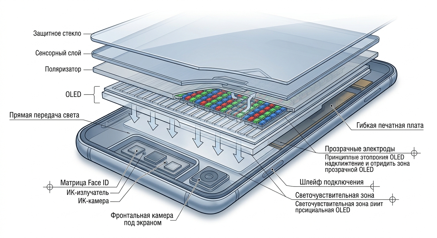 Технические детали. Samsung Display уже демонстрировала OCF‑панели на MWC25, сейчас под заказ Apple доводит процесс изгиба до серийной кондиции. Подэкранные Face ID и камеру Samsung обкатала на складных Galaxy, но Apple, судя по всему, пойдёт дальше: инсайдеры указывают на алгоритмы машинного обучения для компенсации потерь чёткости через пиксельную сетку. Прочность — открытый вопрос: микроизгиб увеличивает риск скола при падении торцом, но компания наверняка внедрит обновлённый Ceramic Shield или альтернативную химию стекла.
